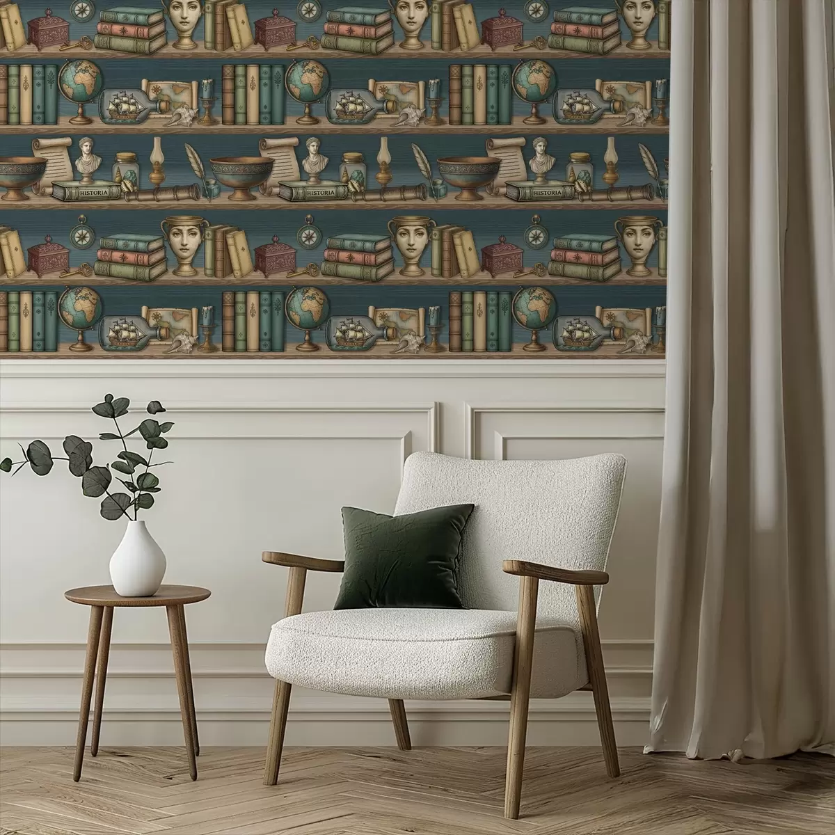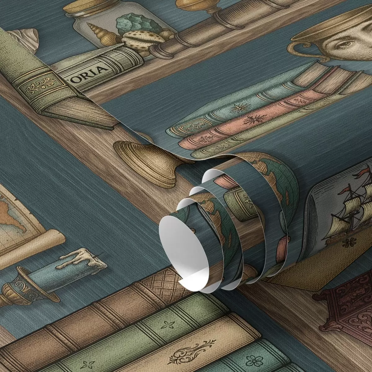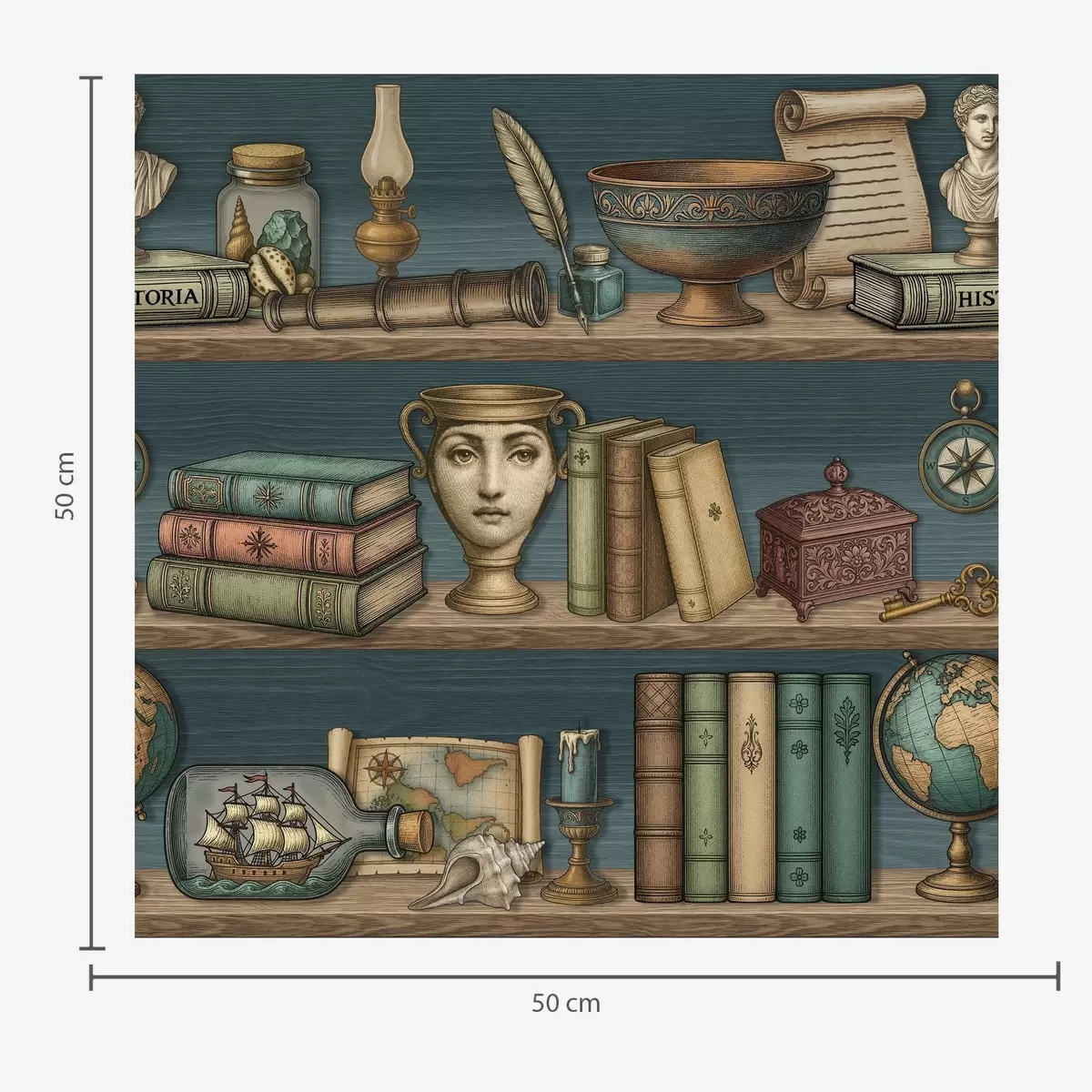 Papiers peints Étagères vintage avec des livres, un globe terrestre et des curiosités marines Nr. a01036