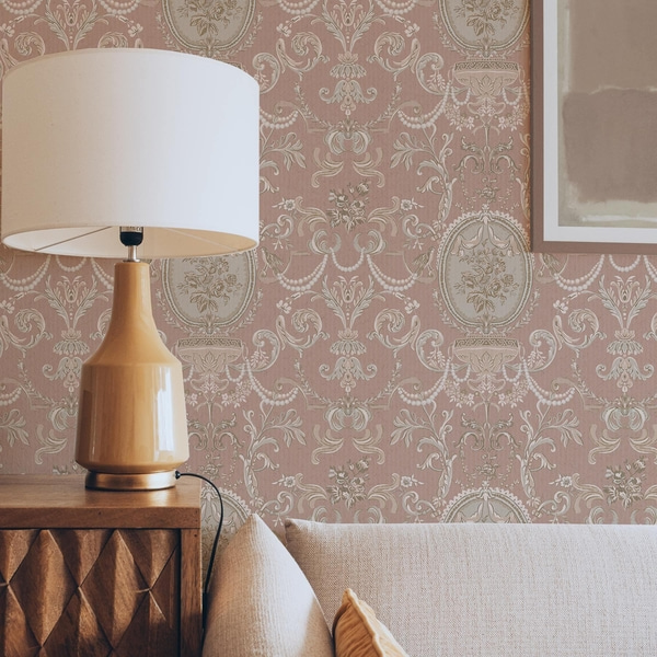 Tapeten Helles Damastmuster mit grauen Rosen in weichen Rauten