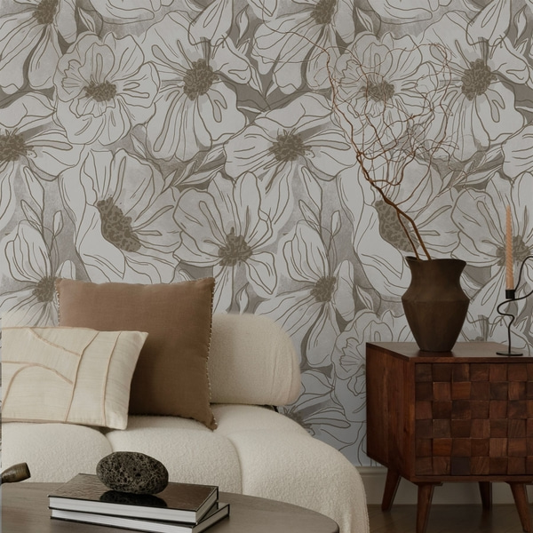 Tapeten Zarte Zweige mit Blüten auf warmem Cremehintergrund