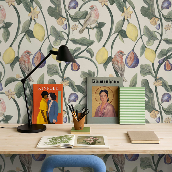 Tapeten Blaue Beeren und helle Blüten auf Elfenbein