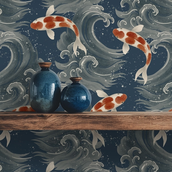 Tapeten Karpfen zwischen Blumen in sanften Beige- und Rosatönen