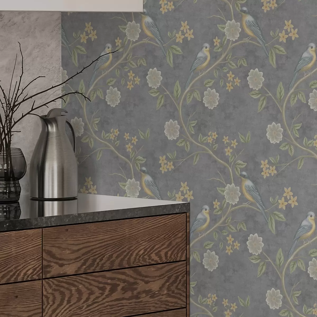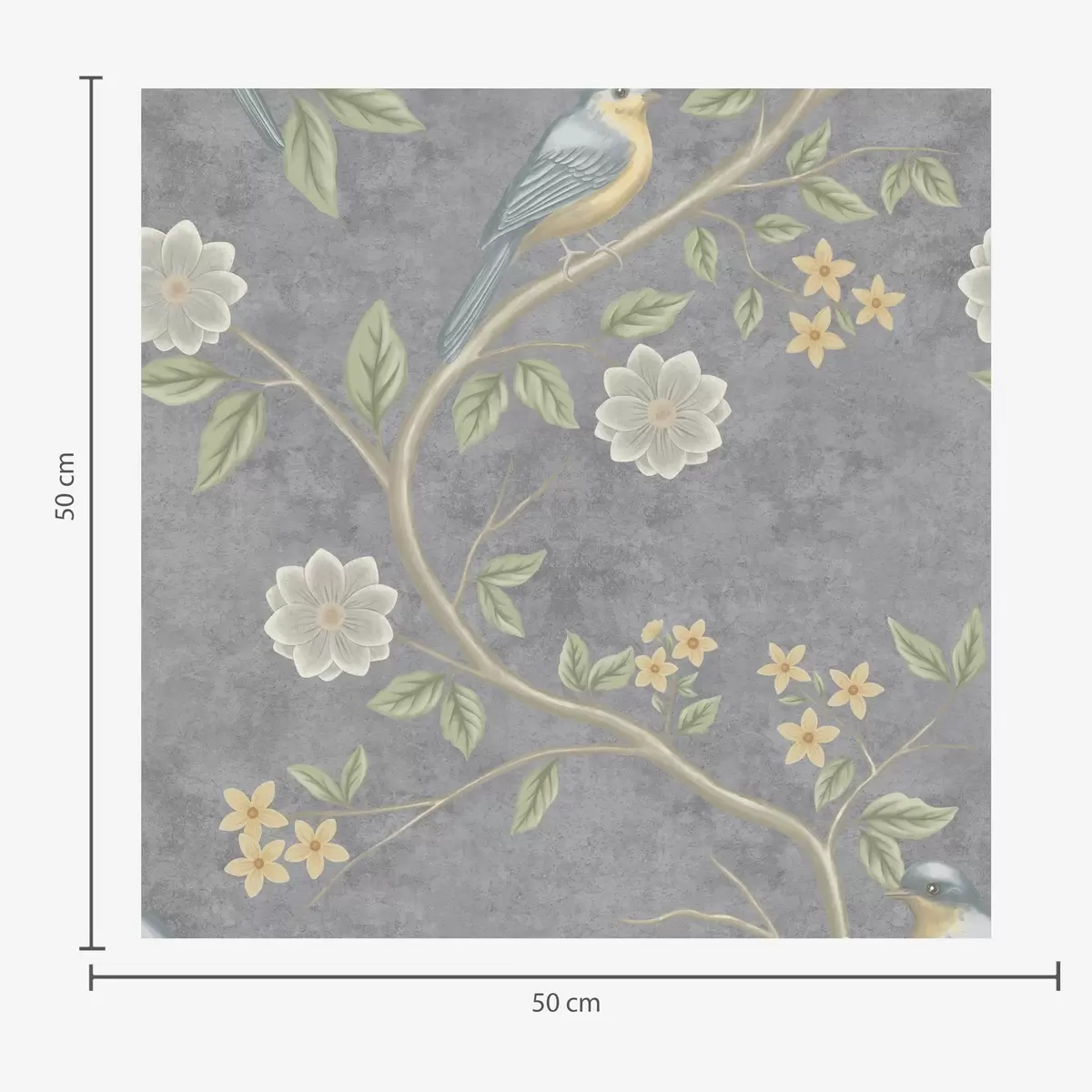 Bildschirmhintergründe Vögel auf Zweigen zwischen Blumen auf einem grauen Hintergrund Nr. a00483