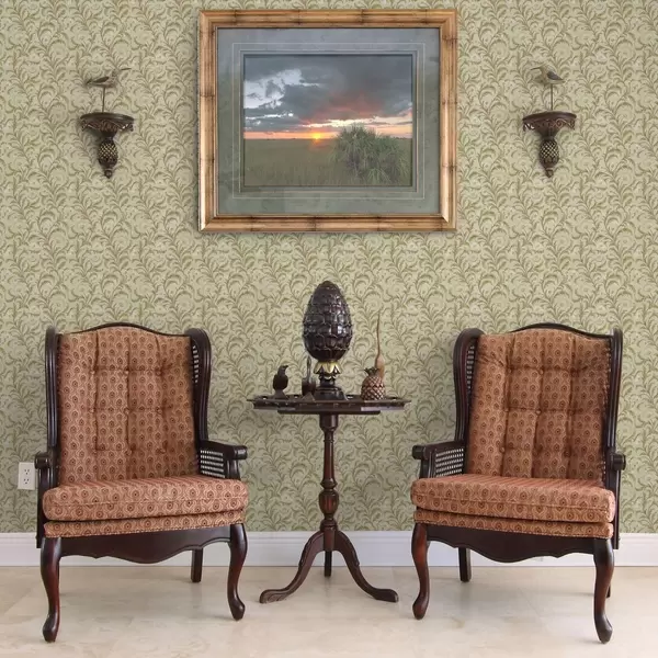 Tapete Vintage-Ornament mit Schnörkeln und Blumen, beige und olivgrün a00574