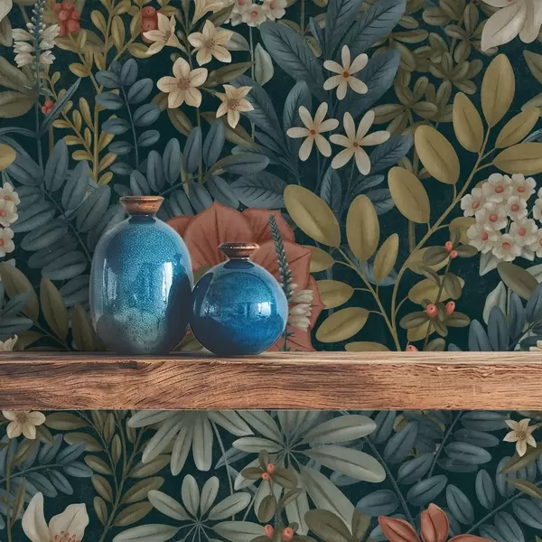 Tapete Dunkler Hintergrund mit dichten Blumen und Blättern in warmen Farbtönen a00678