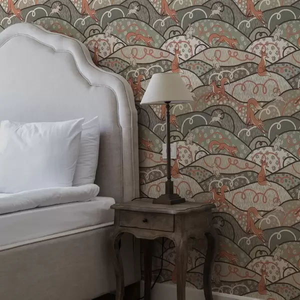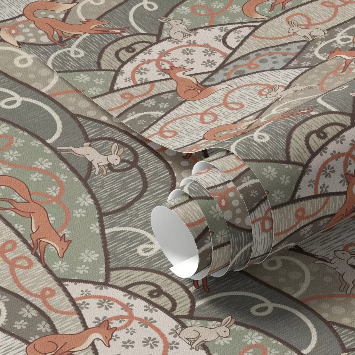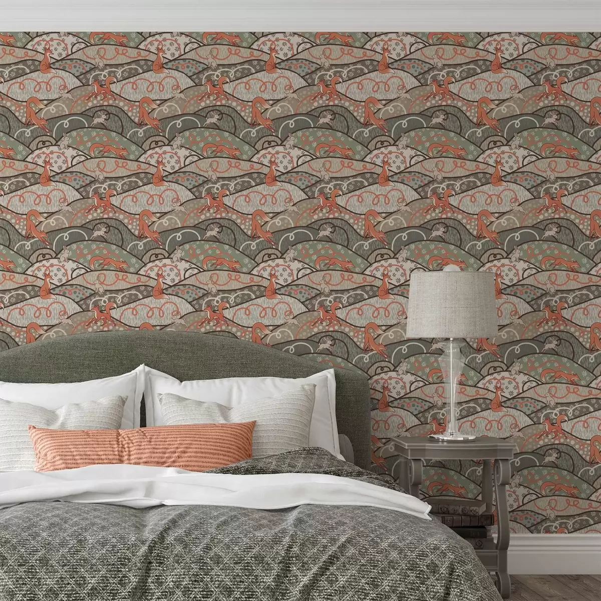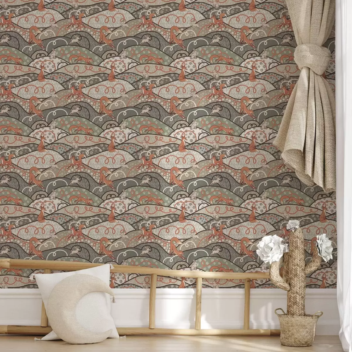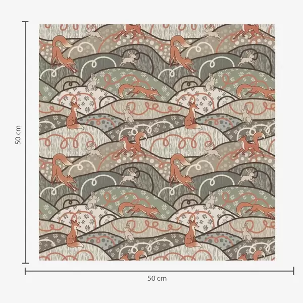Bildschirmhintergründe Füchse und Hasen auf welligen Hügeln, Retro-Muster Nr. a00690