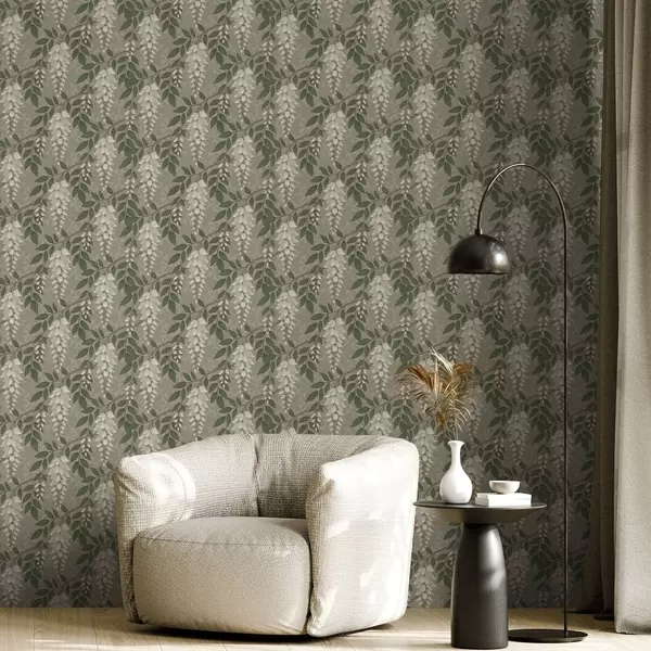 Tapete Helle Glyzinien auf grau-olivfarbenem Hintergrund, herabfallende Trauben a00694