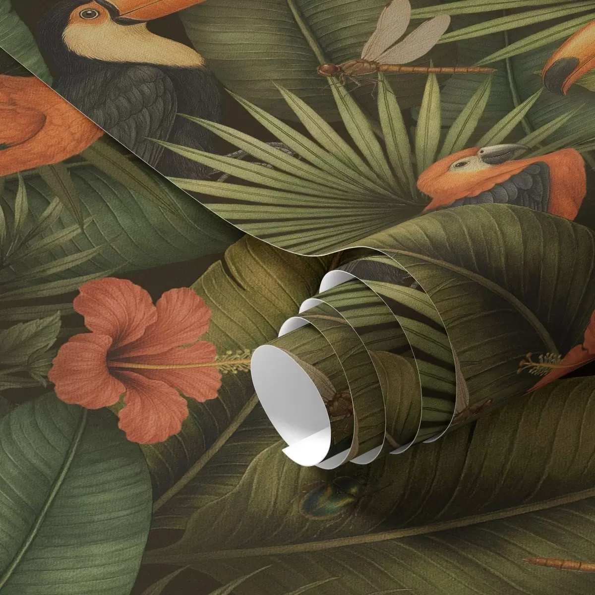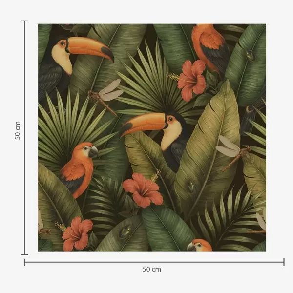 Bildschirmhintergründe Tukan und Papageien zwischen tropischem Laub und Blumen Nr. a00702