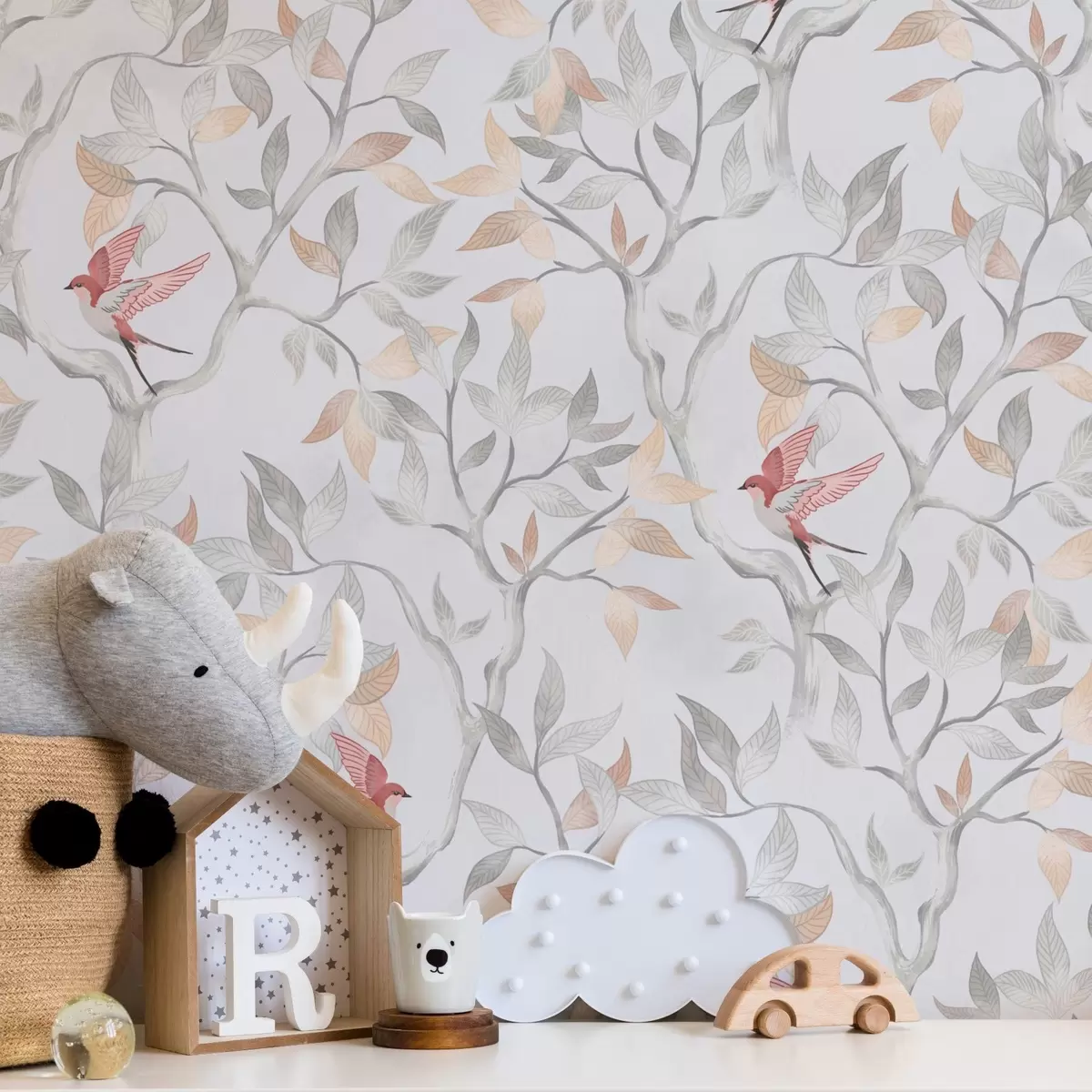 Bildschirmhintergründe Leichte Äste mit Blättern und Vögeln in Pfirsichfarben Nr. a00716