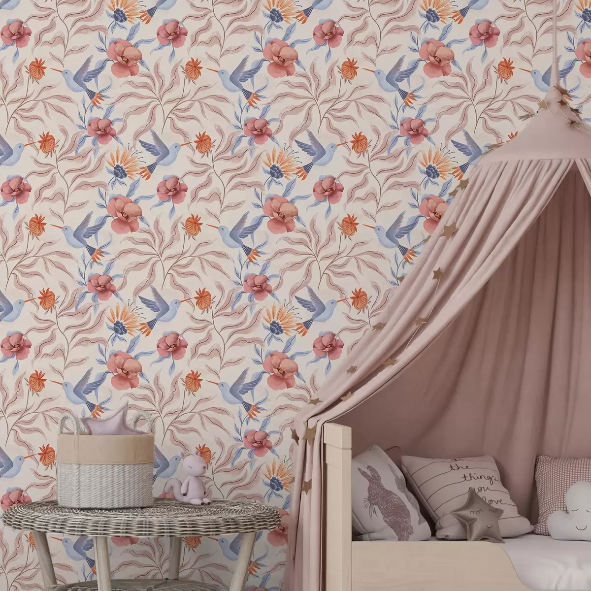 Bildschirmhintergründe Kolibris zwischen großen Blumen in Rosa- und Blautönen Nr. a00733