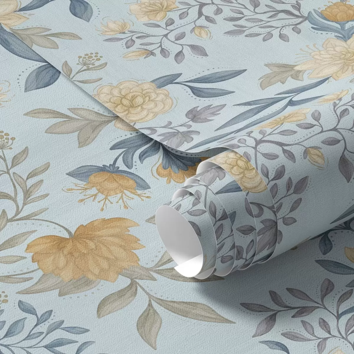 Bildschirmhintergründe Gelbe und blaue Blumen mit Blättern auf himmelblauem Hintergrund Nr. a00934