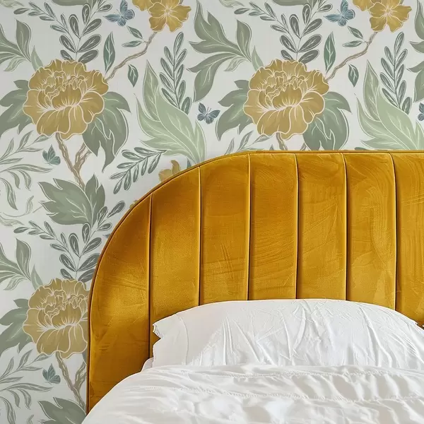 Tapete Große gelbe Pfingstrosen und Grünpflanzen auf hellem Hintergrund a00941