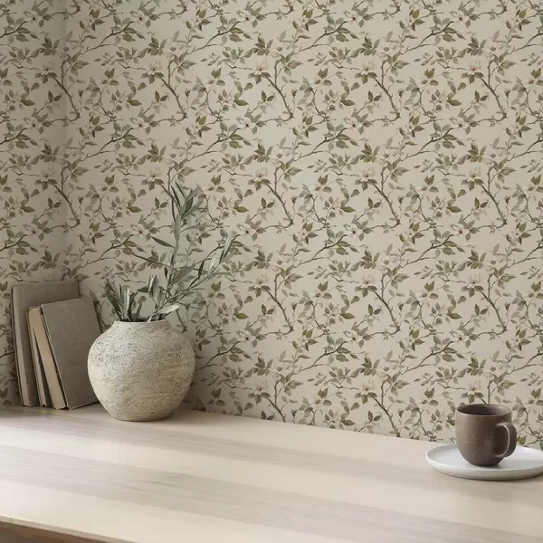 Bildschirmhintergründe Leichte Zweige mit winzigen cremefarbenen Blüten und grünen Blättern Nr. a01028